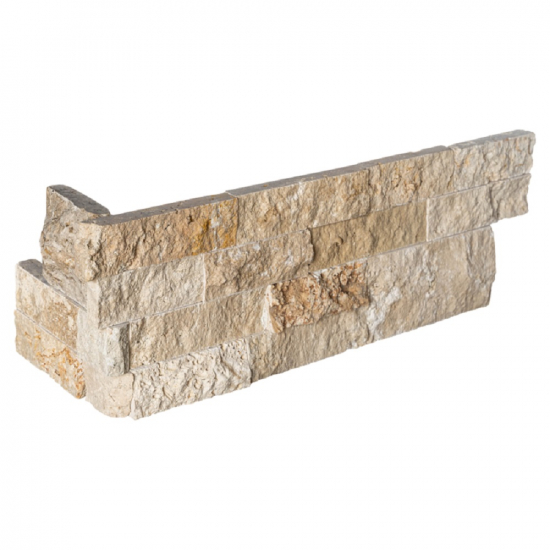 Pierre de parement d'angle en Travertin, monté sur trame en résine rigide.