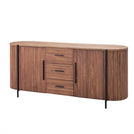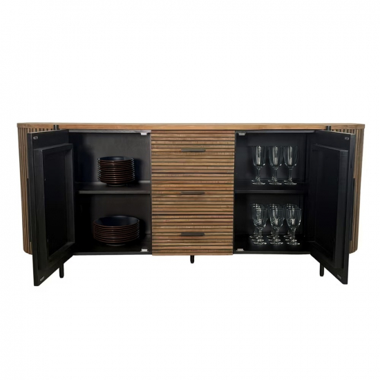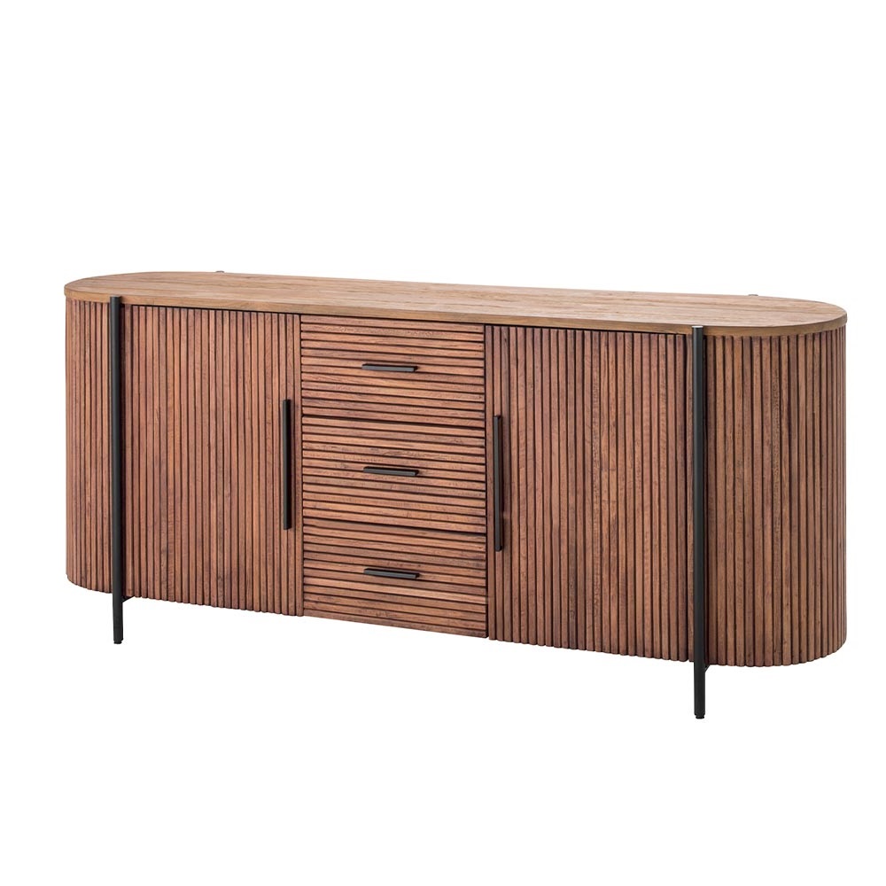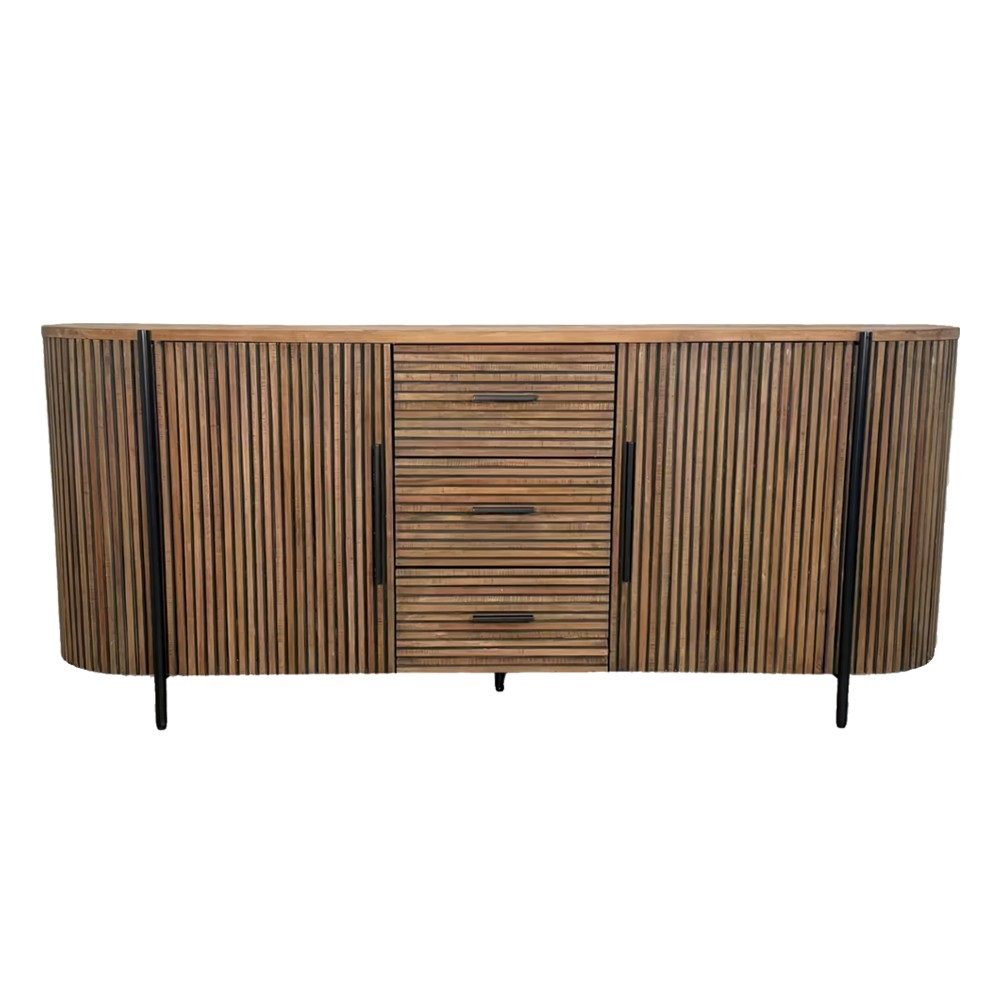 Fabriqué principalement en Mahogany pour sa structure et son plateau en Teck, ce bahut avec sa silhouette arrondie et ses façades en lamelles de bois verticales lui confèrent un style unique, chaleureux et organique, parfait pour structurer un salon. Il dispose de 2 portes avec fermeture aimantée et 3 tiroirs pratiques montés sur rails métalliques pour une ouverture fluide, il offre une organisation optimale pour votre vaisselle, linge de table ou objets du quotidien.