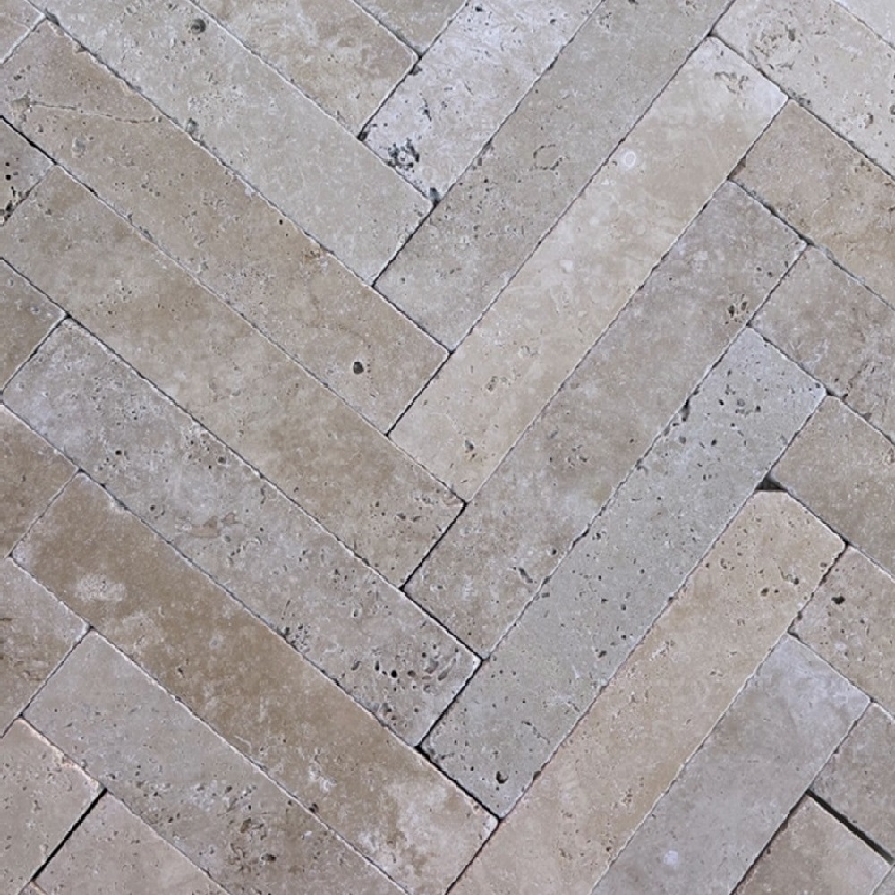 Le petit dallage travertin en chevron Imperia avec sa nuance de beige est un revêtement de sol qui donne un aspect authentique et chaleureux.