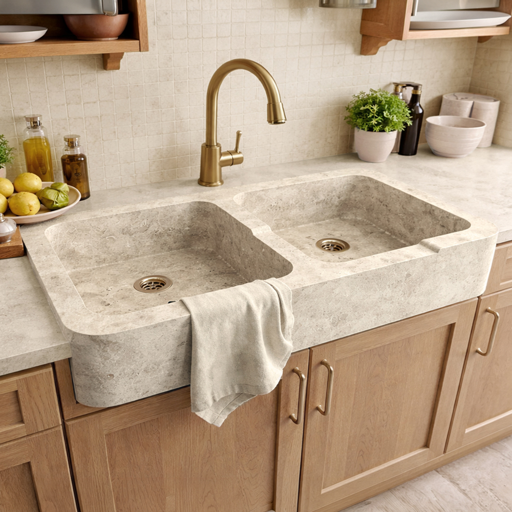 Apportez élégance et authenticité à votre cuisine avec l’évier Clovis en travertin beige. Conçu en pierre naturelle, cet évier à poser avec 2 bacs, allie robustesse, durabilité et esthétique unique. Ses dimensions généreuses offrent un confort d’utilisation optimal, tandis que sa finition adoucie met en valeur les nuances naturelles du travertin. Idéal pour une cuisine moderne, rustique ou haut de gamme.