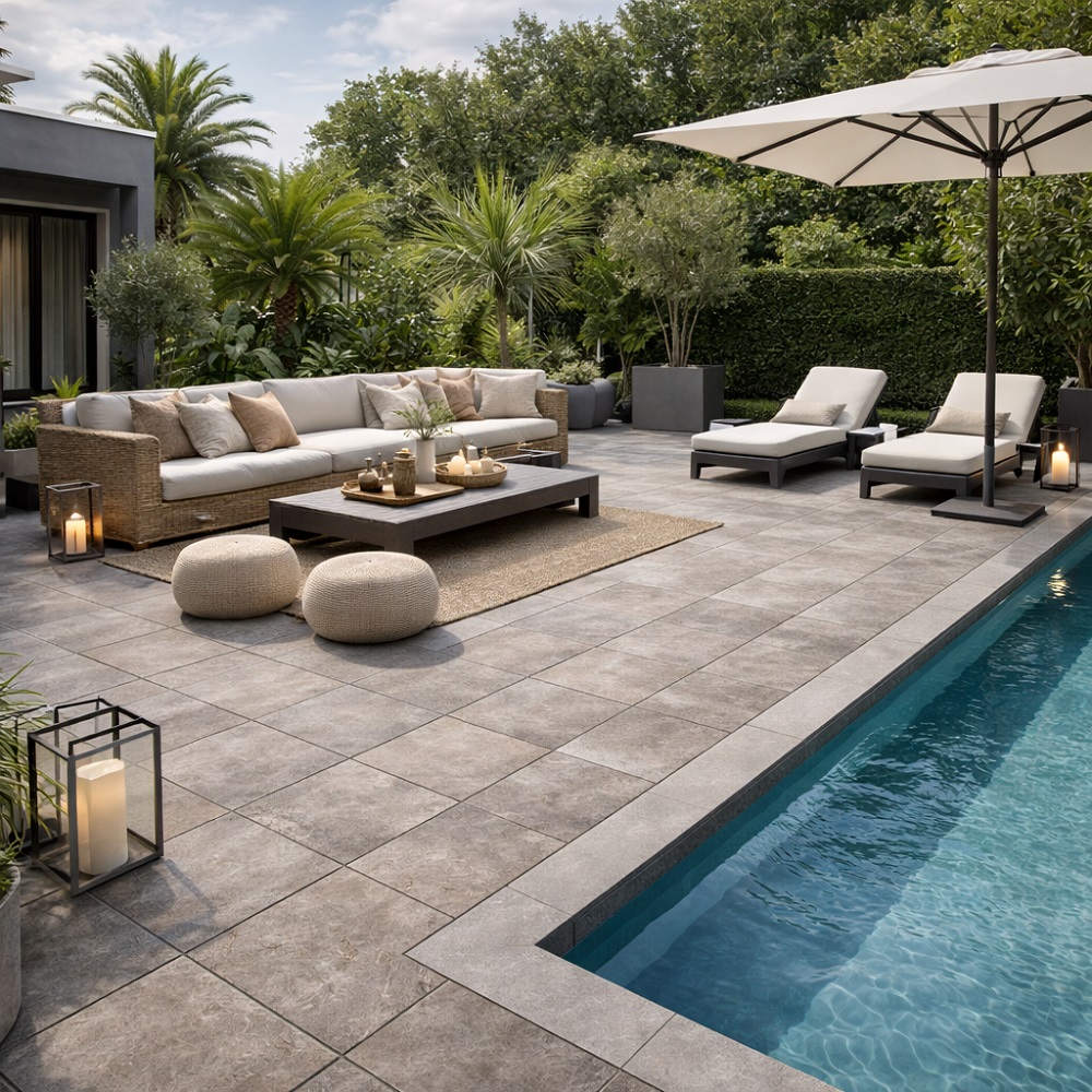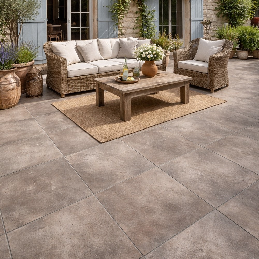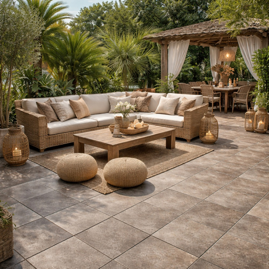Grès Cérame effet pierre naturelle à bords rectifiés et surface structurée, idéal pour valoriser vos espaces sols extérieurs.