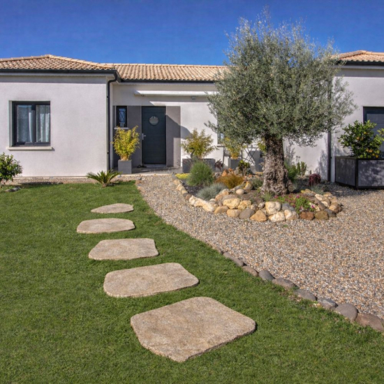 Pas japonais en Grès Cérame Gris / Beige, parfait pour aménager une allée élégante sur pelouse ou gravier. De forme aléatoire 42/36 cm, ce pas japonais s'adapte à tout type de tracé, à vous de créer votre propre chemin.