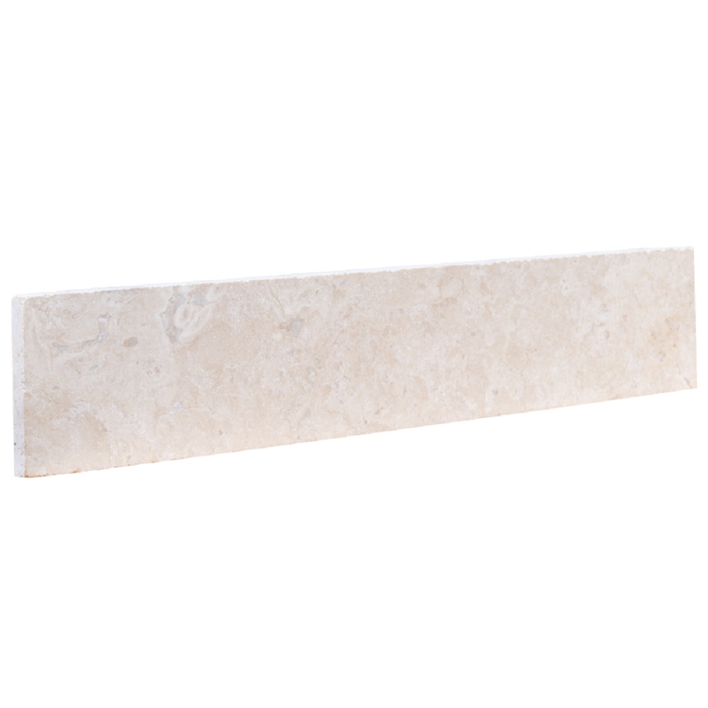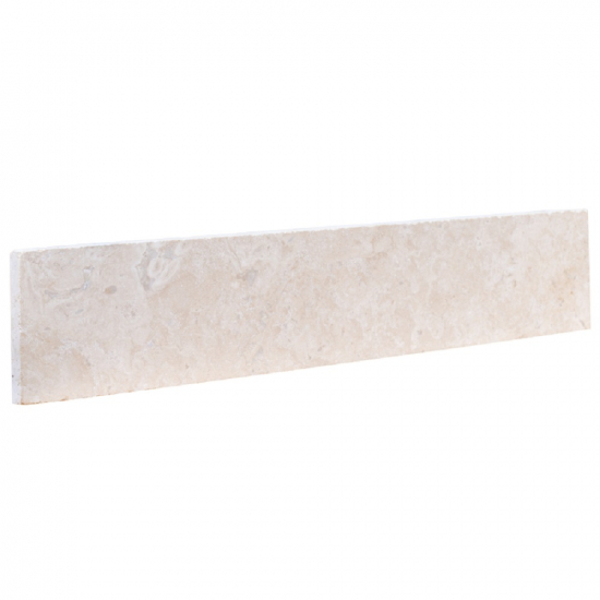 Plinthe en travertin Impéria, pour finir et protéger la jonction entre le sol et le mur intérieurs.