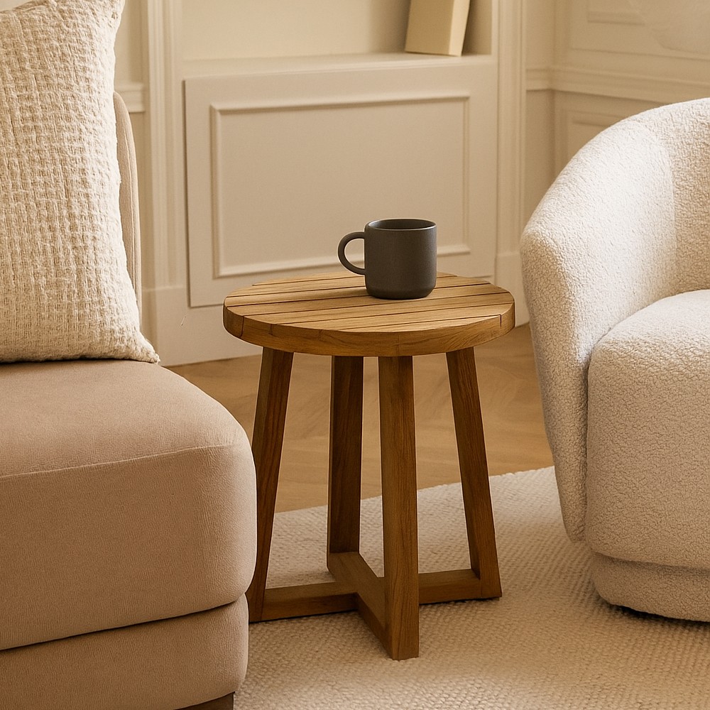 Apportez une touche d’élégance naturelle à votre intérieur avec cette table d’appoint ronde en teck naturel vernis.