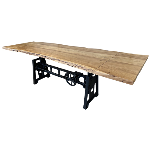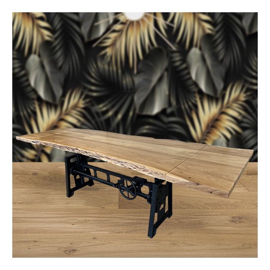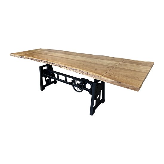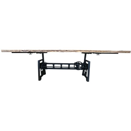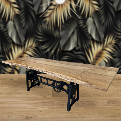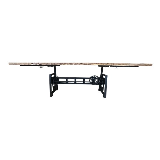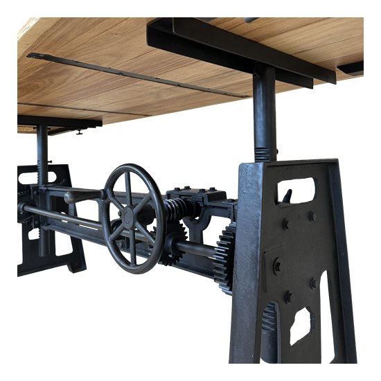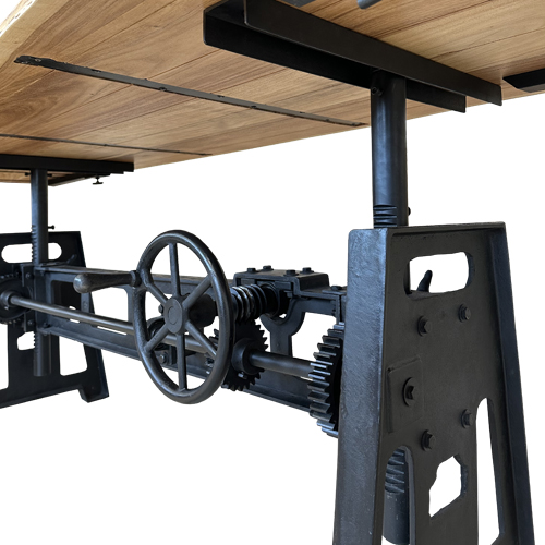 Table élévatrice composée d'un plateau en bois d'Acacia et d'un pied industriel en fonte.