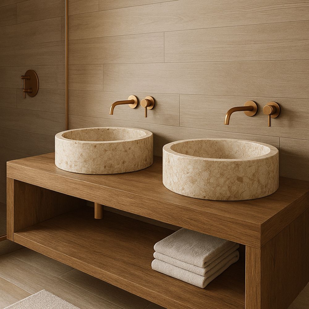 Vasque à poser en travertin, ses lignes harmonieuses vous séduiront.