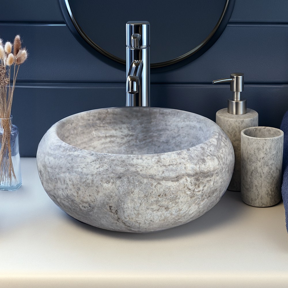 Vasque à poser en travertin, ses lignes harmonieuses vous séduiront.