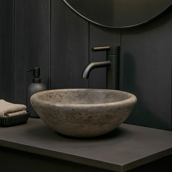 Vasque à poser en travertin, ses lignes harmonieuses vous séduiront.