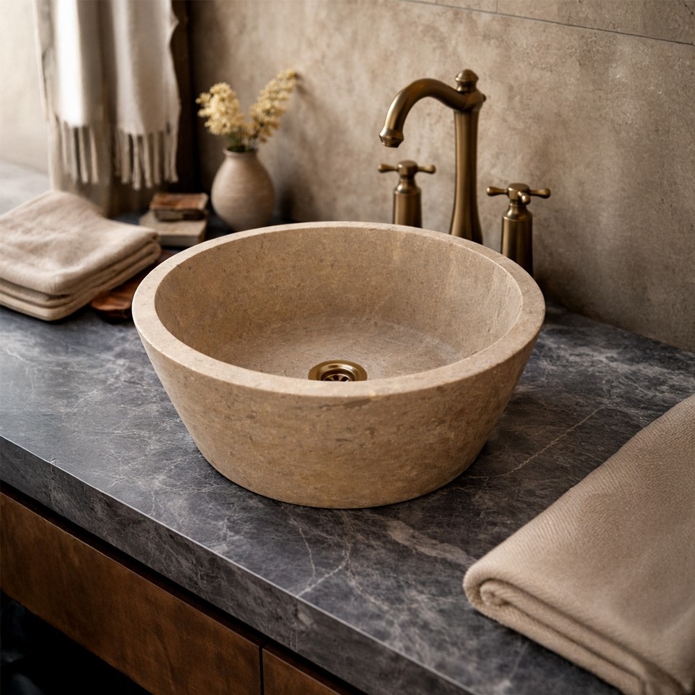 Vasque à poser en travertin, ses lignes harmonieuses vous séduiront.